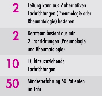 Das Kernteam wird aus einer Fachärztin bzw. einem Facharzt fürgebildet. Die Mitglieder des Kernteams sind Fachärztinnen und Fachärzte, deren Kenntnisse und Erfahrungen zur Behandlung in der Regel eingebunden werden müssen. Innere Medizin und Pneumologie und Innere Medizin und Rheumatologie