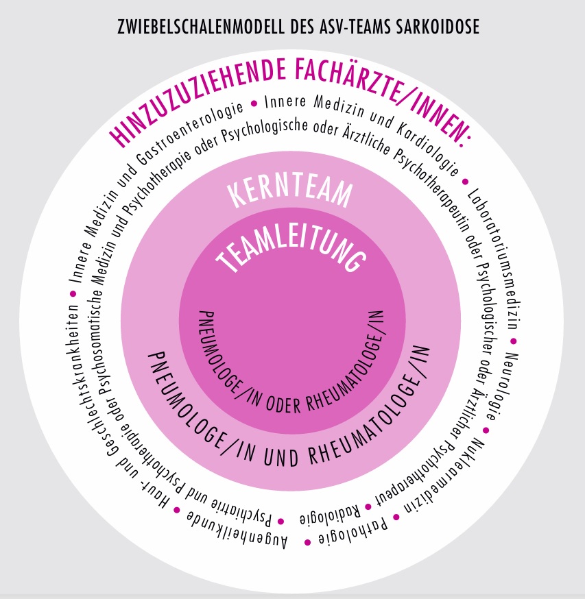 Die Sarkoidose kann sich überall im Körper als granulomatö se Entzündung mit Bindesgewebsknötchen ausbilden, deren Diagnose und Abgrenzung zu weiteren Erkrankungen schwierig sein kann. In Abwägung dieser Aspekte wurden Fachgruppen in die verschiedenen Ebenen des ASV-Teams aufgenommen, so die neue Richtlinie.Teamleitung